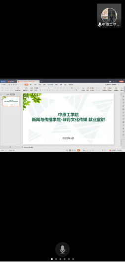 为了更好的解决大学生就业问题,缓解毕业生就业压力,拓宽就业与招聘的双向通道,2022年5月24日下午,新闻与传播学院与郑州肆月文化传媒有限公司举办了线上宣讲会,宣讲会由学院党委副书记马肖华主持。