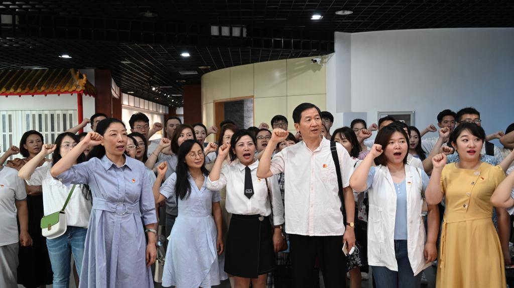 参观结束后,师生党员在党委书记杨静的领誓下,重温了入党誓词。全体党员们再次接受了入党誓词的洗礼,进一步坚定理想信念,纷纷表示在今后的工作、学习、生活中一定以昂扬的士气、进取的心态和创先争优的精神践行入党誓词。