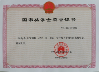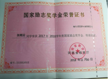 勤奋努力、刻苦学习是学生本分,更是大学生活永恒不变的主题。张高沿始终把学习作为第一要务,坚持做到课前预习课后复习,认真上好每一堂课,用心完成每一件事。经过刻苦努力,大一大二学年连续获得国家励志奖学金,大三学年获得国家奖学金,大四学年先后获得河南省三好学生、河南省优秀应届毕业生等荣誉称号。