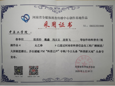 在学科竞赛上,他所获得的成绩同样也是硕果累累。在老师指导下,他和团队成员共同创作的《太乙拳》荣获河南省全媒体科普传播中心创作基地作品采用证书;他负责的大学生创新创业训练计划项目(省级)成功结项。