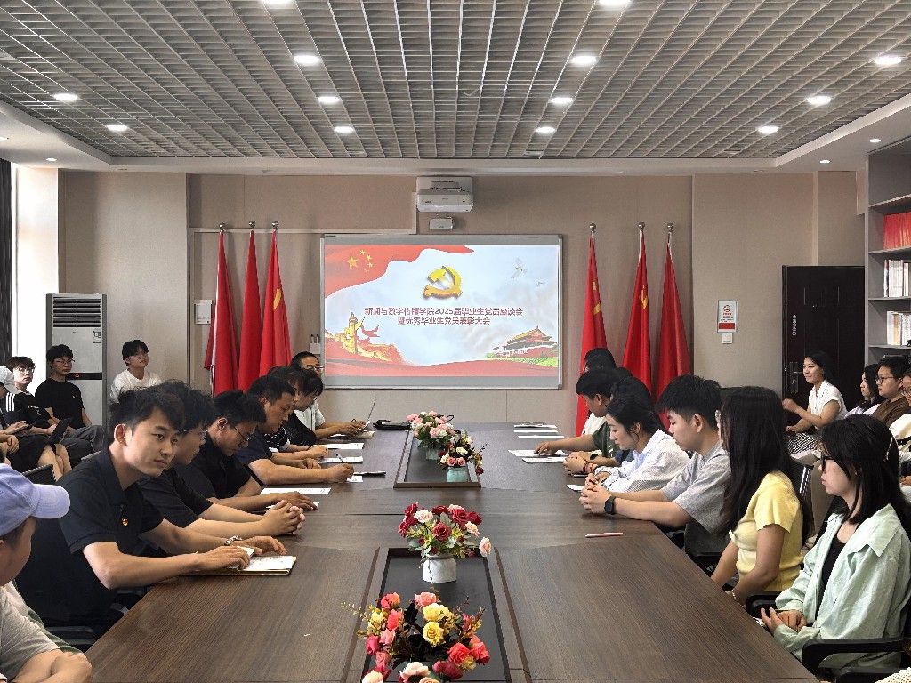 在3号组团楼B904会议室召开2025届毕业生党员离校教育座谈会暨优秀毕业生党员表彰大会。学院党委书记崔涛、党委副书记马肖华、正科级组织员刘彦明、毕业年级辅导员耿佳鑫、各学生党支部书记及2025届全体毕业生党员参加。会议由马肖华主持。
