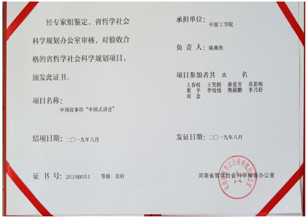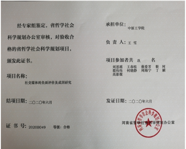 2.河南省哲学社会科学规划项目结项证书